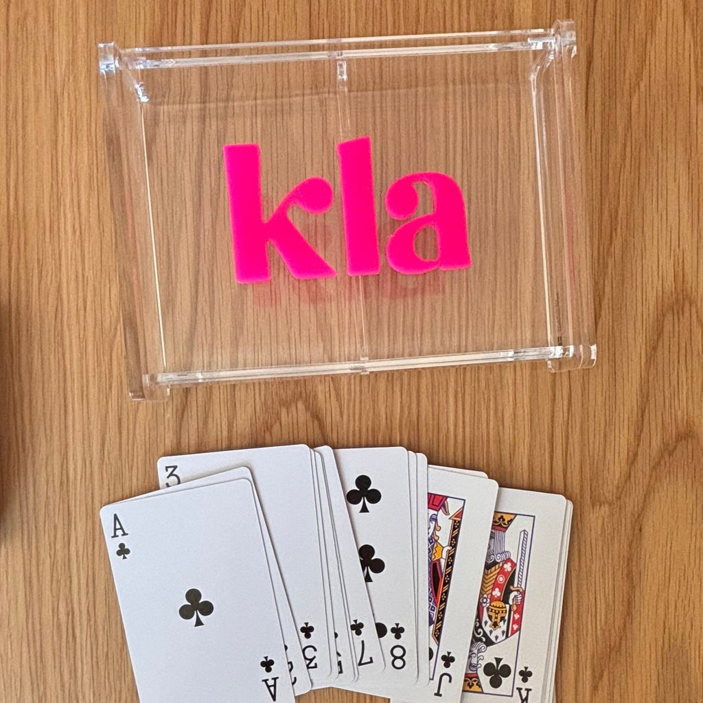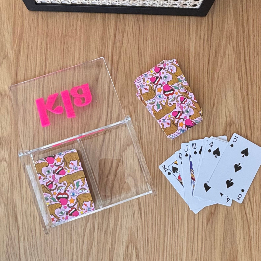 Table talk is definitely allowed when it comes to this personalized acrylic double-deck card tray. 2 fun colorful playing card decks are included. The perfect gift for any Canasta Queen! Choice of acrylic name or initials color.